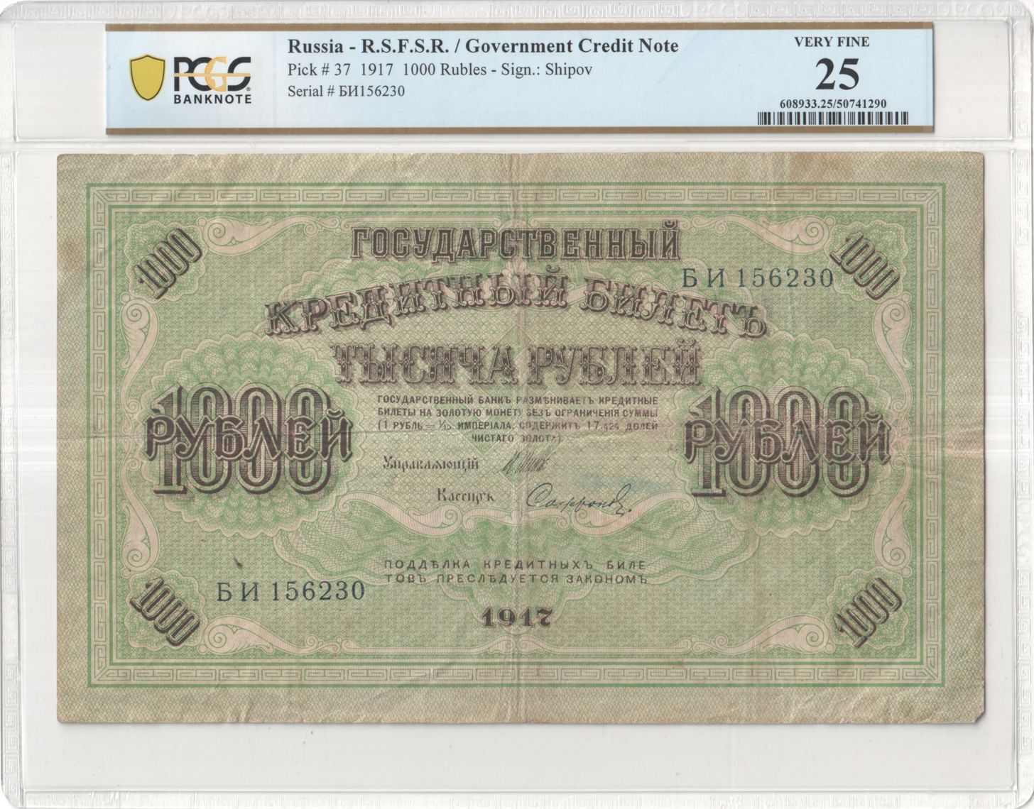 1917 Russia RSFSR / Government Credit Note – 1000 Rubles PCGS VF25