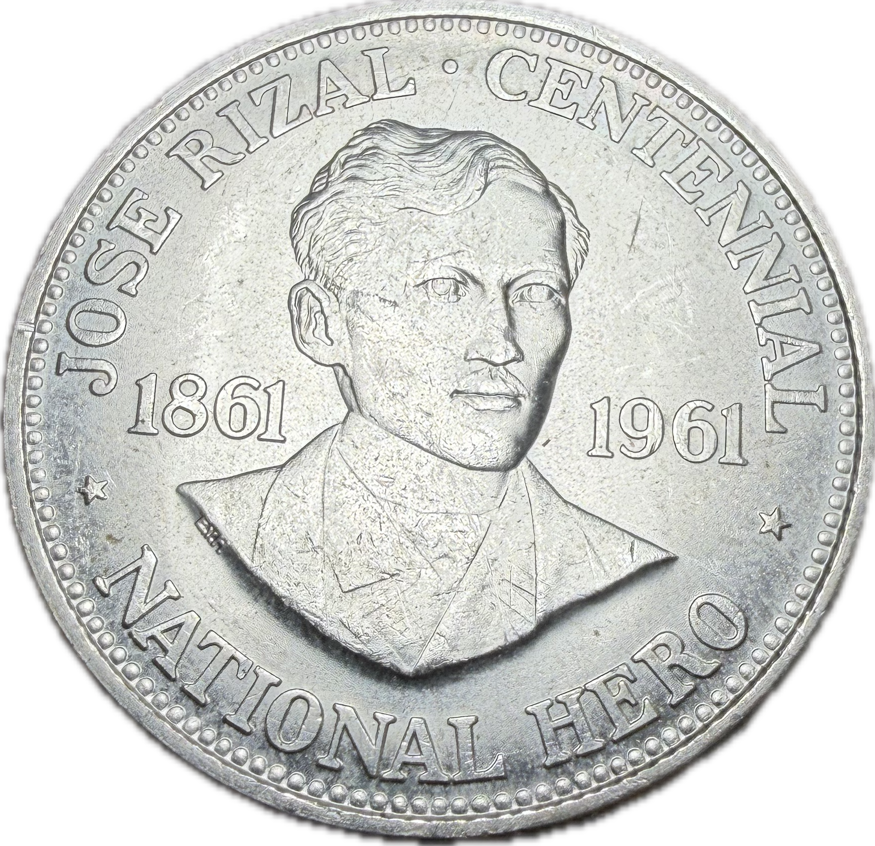 Obverse: Portrait of José Rizal with the dates 1861–1961, marking the centennial of his birth.